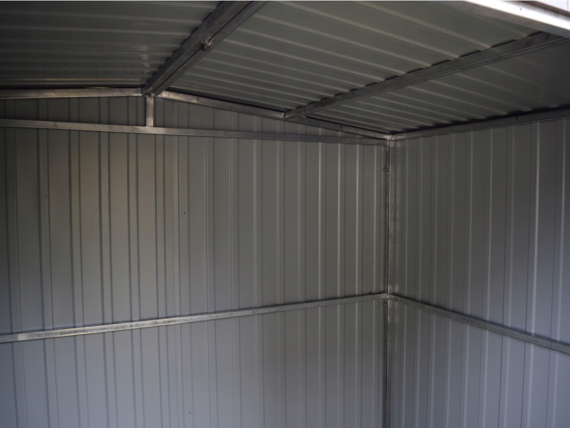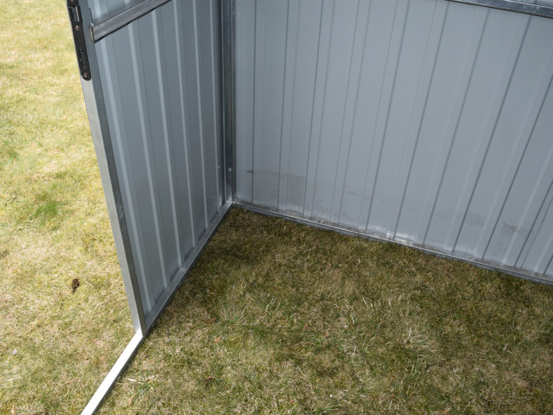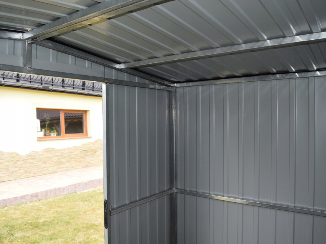Zahradní domek, domek na nářadí vyrobený z žárově zinkovaných uzavřených profilů a trapézového plechu v barvě RAL lesklá z naši nabídky. Trapézový plech síly 0,45 mm je nanýtován na pevné konstrukci z uzavřených čtvercových profilů 30x30 mm. Jednotlivé díly jsou spolu spojeny šrouby a maticemi.