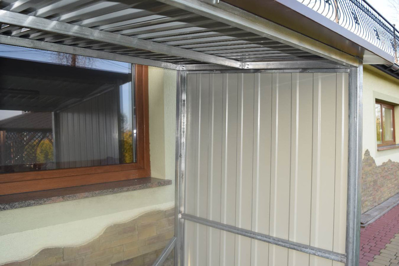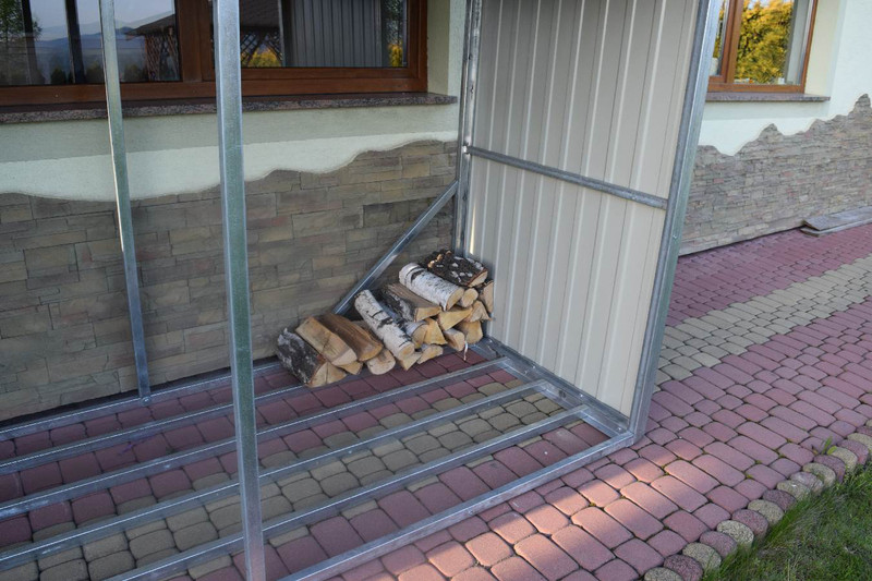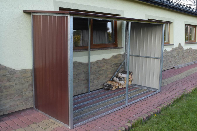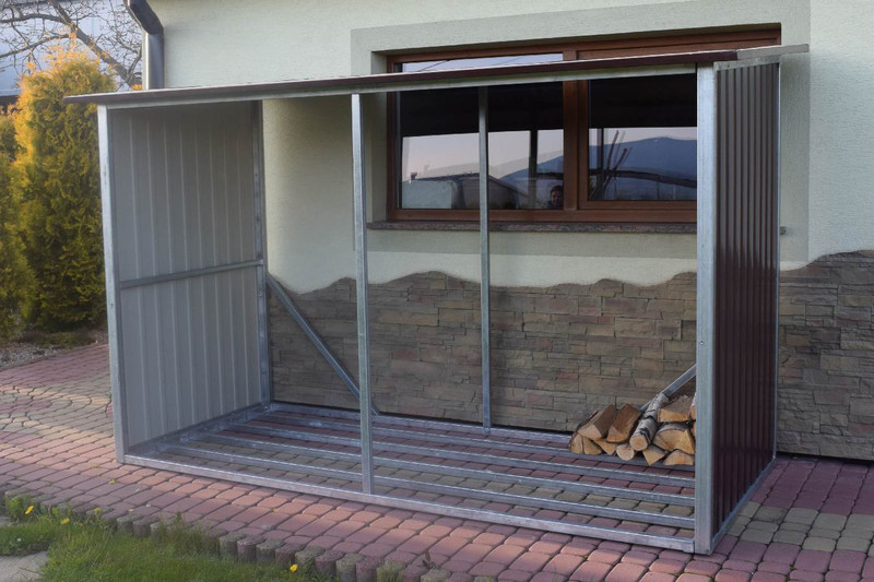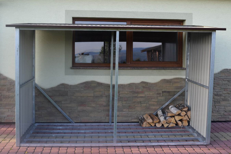 Přístřešek na dřevo, dřevník vyrobený z žárově zinkovaných uzavřených profilů a trapézového plechu v barvě. Jednotlivé díly a konstrukční prvky jsou spolu spojeny šrouby a maticemi.