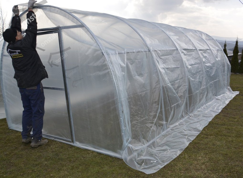 Fólie se přisypává zeminou ve spodní části konstrukce. Fólii na konstrukci si osazuje klient svépomocí. Po natažení fólie na čelní a zadní díl fóliovníku je třeba vyříznout otvor pro dveře a dodanou fólii natáhnout na konstrukci dveří. Vyříznutý díl fólie z otvoru pro dveře je třeba instalovat do okenního otvoru. Pro napnutí je fólie osazena po okrajích šňůrkami.