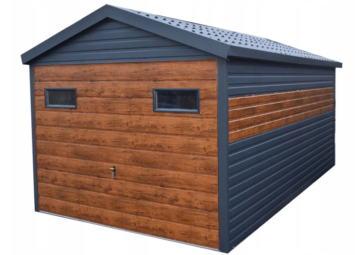Vyplňte údaje ve formuláři. Garáž s vodorovným položením plechu na stěnách, klempířské prvky na střeše a stěnách, okapy a s okny ve vratech