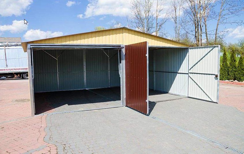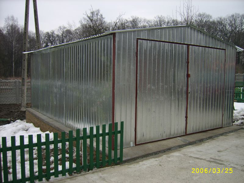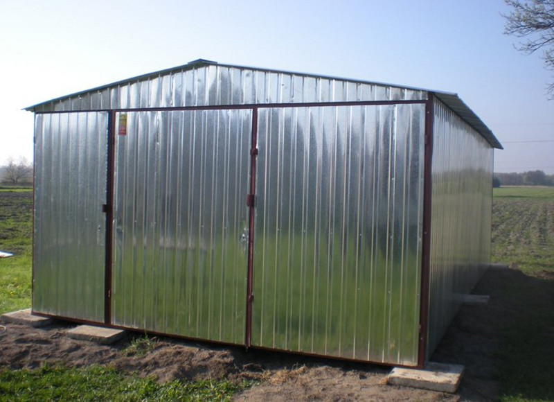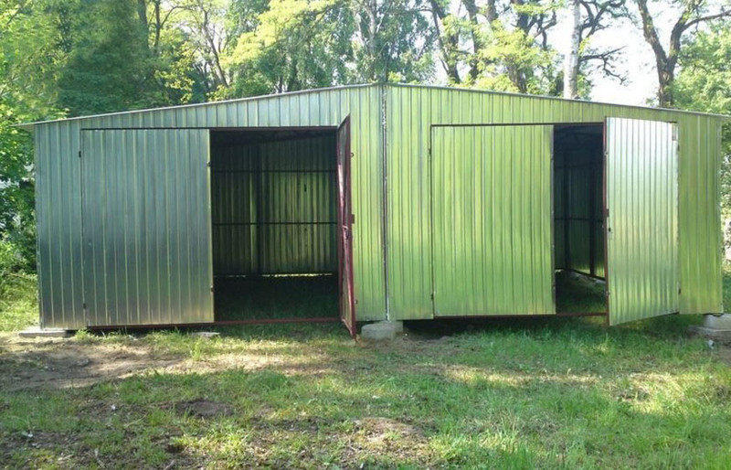Plechová garáž 3x5 se sedlovou střechou a dvoukřídlými vraty z pozinkovaného plechu, s konstrukcí z úhelníků žárově zinkovanýchů, nebo se zesílenou konstrukcí z uzavřených čtvercových profilů 30x30 mm žárově zinkovaných.