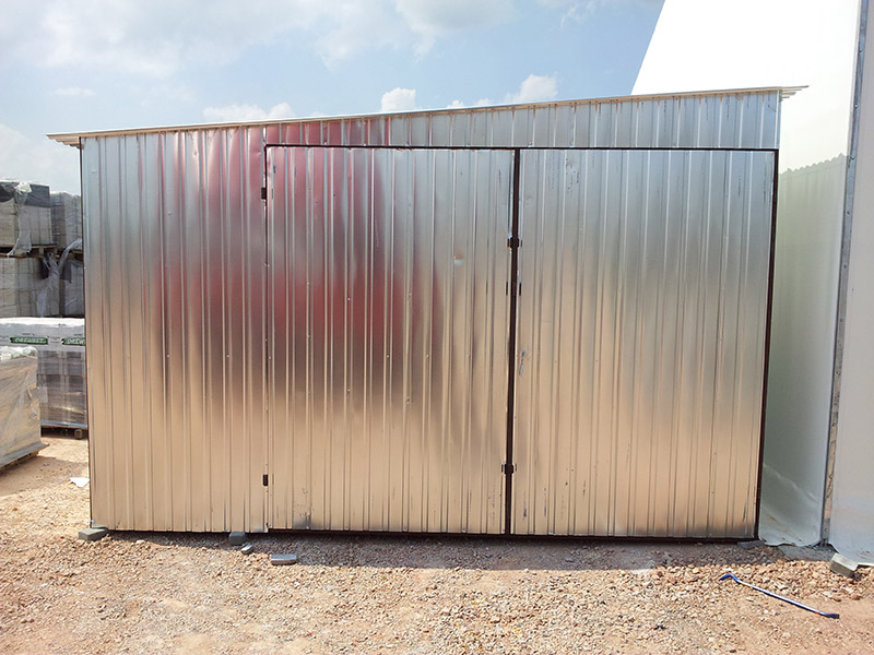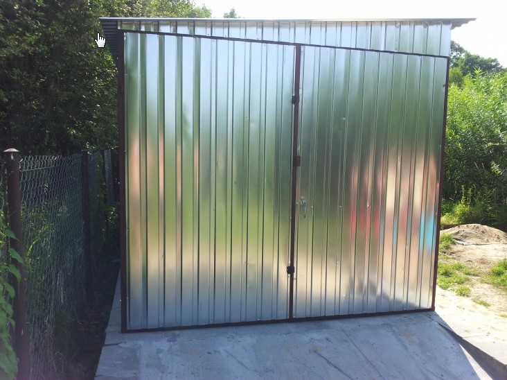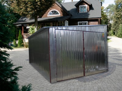 Standardní plechová garáž o šířce 3m (2,97m) x 5m (4,97m) se střechou na stranu a dvoukřídlými vraty. Konstrukce garáže je vyrobena z úhelníků žárově zinkovaných nebo z uzavřených čtvercových profilů 30x30 mm žárově zinkovaných. Na konstrukci je pomocí hliníkových nýtů uchycený trapézový pozinkovaný plech. Hotové díly jsou k sobě spojeny pomocí šroubů tvoříc tak kompaktní a odolnou konstrukci. Vhodné jako garáž pro auto, motorku, kola, zahradní techniku. Ideální jako stavební buňka, nebo zahradní domek, sklad. Materiály používané pro výrobu jsou vybrány racionálně, což zajišťuje odolnost, funkčnost a bezpečnost výrobku.