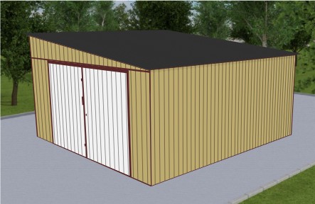 Plechová garáž 3x5 se střechou na stranu a dvoukřídlými vraty z pozinkovaného plechu, s konstrukcí z úhelníků žárově zinkovanýchů, nebo se zesílenou konstrukcí z uzavřených čtvercových profilů 30x30 mm žárově zinkovaných.
