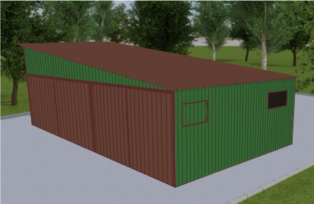 Standardní plechová garáž o šířce 3m (2,97m) x 5m (4,97m) se střechou na stranu a dvoukřídlými vraty. Konstrukce garáže je vyrobena z úhelníků žárově zinkovaných nebo z uzavřených čtvercových profilů 30x30 mm žárově zinkovaných. Na konstrukci je pomocí hliníkových nýtů uchycený trapézový plech v barvě RAL z naší nabídky nabídky plechů.. Barvy je možné kombinovat - jiná barva stěn, střechy, vrat. Hotové díly jsou k sobě spojeny pomocí šroubů tvoříc tak kompaktní a odolnou konstrukci. Vhodné jako garáž pro auto, motorku, kola, zahradní techniku. Ideální jako stavební buňka, nebo zahradní domek, sklad.