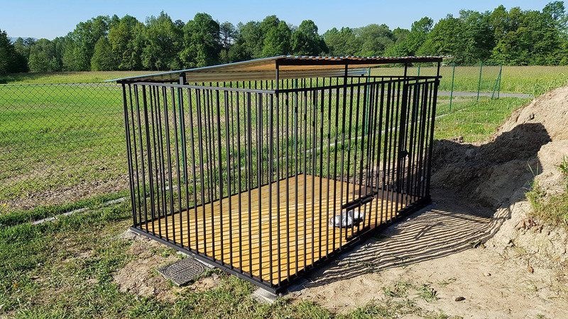 Konstrukce klece z uzavřených profilů 20x20 mm, jeklů, lakovaných černou barvou, síla stěny cca 1,5 mm. Konstrukce svařovaná, střecha z trapézového pozinkovaného plechu T-14, odstupy mezi příčkami cca 9 cm, dvířka 80 cm s petlicí, spád střechy dozadu.