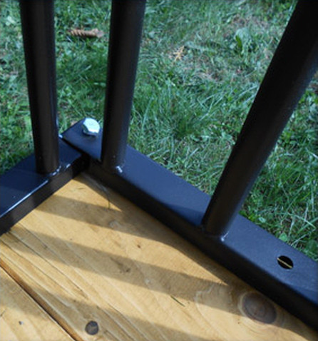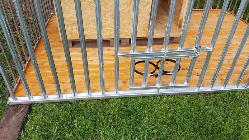 Kotec z černě lakovaných trubek trubek ø20 a síle stěny 1,5 mm ( některé trubky můžou mít malé dírky vzniklé v průběhu svařování. Nemá to vliv na stabilitu celé konstrukce ). Konstrukce svařovaná, střecha z trapézového pozinkovaného plechu T-14, odstupy mezi příčkami cca 9 cm, dvířka 80 cm s petlicí, spád střechy dozadu.