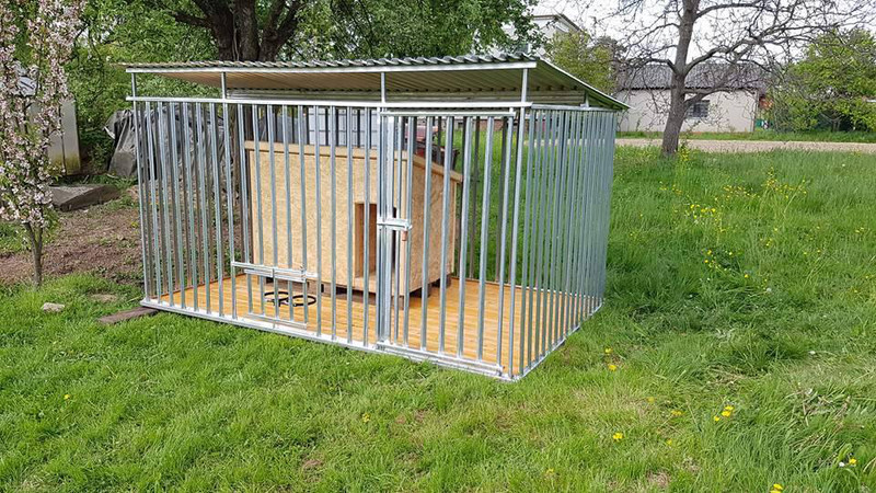 Kotec z pozinkovaných úhelníků 25x25. Konstrukce svařovaná, střecha z trapézového pozinkovaného plechu T-14, odstupy mezi příčkami cca 9 cm, dvířka 80 cm s petlicí, spád střechy dozadu.